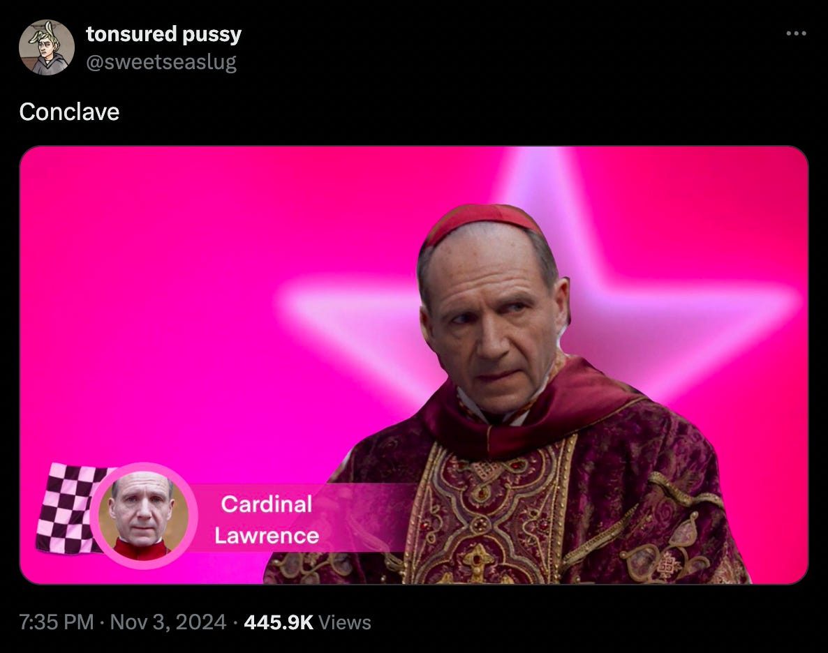 Turns out that wasn’t an original thought. Whatever your guilty televisual pleasure - Mean Girls, Real Housewives of Beverley Hills, or my beloved Drag Race - chances are that the Very Online have created a Conclave meme.